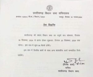 छत्तीसगढ़ के षष्ठम् विधानसभा का शीतकालीन सत्र 16 दिसंबर 2024 से प्रारंभ होकर 20 दिसंबर 2024 तक चलेगा, जिसमें 4 बैठकें आयोजित होंगी।