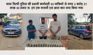 श्री राजेश अग्रवाल के मार्गदर्शन तथा अति. पुलिस अधीक्षक श्री पुष्पेन्द्र बघेल एवं उप पुलिस अधीक्षक नक्सल चिल्पी श्री सतीश धुर्वे के दिशा-निर्देश में बार्डर पर अवैध तस्करों एवं अन्य अपराधिक गतिविधीयों पर लगातार प्रभावी कार्यवाही करने निर्देषित किया गया है। इसी तारतम्य में थाना प्रभारी श्री उमाशंकर राठौर के कुशल नेतृत्व में चाना चिल्पी टीम द्वारा आबकारी चेकपोस्ट के पास संदिग्ध वाहनों का लगातार सघन चेकिंग किया जा रहा है आज दिनाक-11/10/2024 को चेकिंग के दौरान प्रातः करीबन 09:30 बजे मण्डला तरफ से एक नीला रंग का मारुजि एस कास कार क्रमांक एमपी-51, सीए-9891 आया जिसे रोका गया उसमें 03 लोग बैठे थे जिनका नाम पता पुछने पर अपना नाम-01. गगन जैन पिता स्व. गिरीश जैन उम्र 33 साल सा. वार्ड-08 श्रीराम वार्ड मण्डला जिला-मण्डला म.प्र. 02. अमन जैन पिता स्व. गिरीश जैन उम्र 30 साल सा. वार्ड-08 श्रीराम वार्ड मण्डला जिला-मण्डला म.प्र., 03. नवीन ठाकुर पिता ताराचंद्र ठाकुर उम्र-25 साल सा. हेजा नगर थाना महराजपुर जिला-मण्डला म.प्र., बताये वाहन को चेक करने पर पीछे कार की डिग्गी में अलग-अलग थैलियों में 500-500 सौ रूपये के गड्डी भारी मात्रा में नगदी रकम मिला। उक्त वाहन क्रमांक एमपी-51, सीए-9891 एवं वाहन में बैठे 03 व्यक्तियों को थाना परिसर लाकर उक्त वाहन में रखे नोटों से भरे थैलियों को निकालकर नौट गिनने वाले मशीन मंगवाकर नोटों का गिनती किया गया। गिनती करने पर 500-500 सी रूपये के 455 गड्डीयों प्रत्येक गड्डी में 500 रू. के 100 नग नोट प्रत्येक गड्डी में 50 हजार रू. की राशि है जुमला नोट की संख्या 45500 हजार नग नोट जुमला राशि कुल 2,27,50000 / रूपये (अक्षरी दो करोड़ सत्ताईस लाख पचास हजार रूपये) एवं एस काम कार क्रमांक एमपी-51, सीए-9891 कीमती 400000 रू. कुल जुमला 2,31,50000 रू. को जप्त किया गया संदेहियो से उक्त रकम के संबंध में पुछताछ करने पर रायपुर में प्रापर्टी खरीदने के नाम पर लेजाना बताये एवं जप्त रकम के संबंध में कोई दस्तावेज प्रस्तुत नही कर सके। जिस पर थाना चिल्फी मे उचित वैधानिक कार्यवाही किया गया है। एवं अग्रीम कार्यवाही हेतु आयकर विभाग को सूचना दिया गया है।